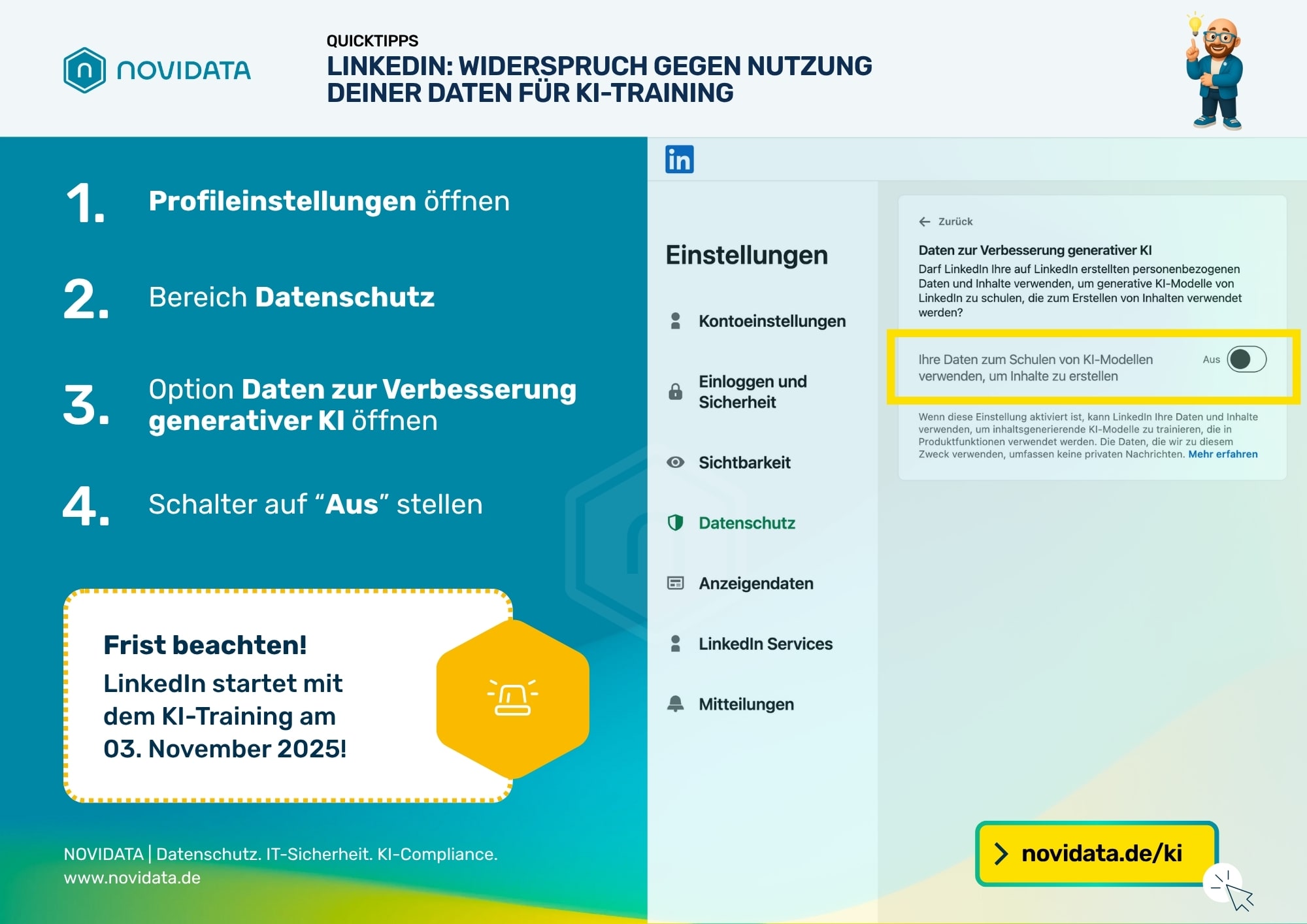 Wenn du dich und deine Mitarbeitenden besser schützen möchtest, dann ist NOVICADEMY.PRO die ideale E-Learning-Plattform für dich – mit verständlichen Kursen zu Datenschutz, IT-Sicherheit und KI-Compliance.